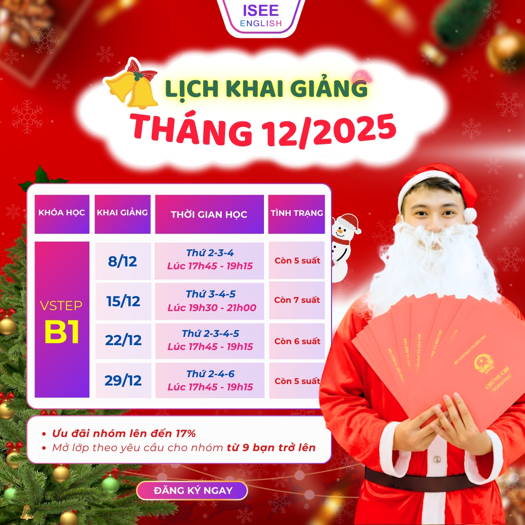 Trang chủ Thông tin khai giảng LỊCH KHAI GIẢNG THÁNG 12 LỊCH KHAI GIẢNG THÁNG 12Các tin khácKhóa học VSTEP B1, B2, C1 - Tiếng Anh Bộ GD&ĐT TOEIC 400-750 - Tiếng Anh Quốc Tế IELTS - Tiếng Anh Quốc Tế iTALK - Tiếng Anh Giao Tiếp iBASIC - Tiếng Anh Căn Bản ISEE Kids - Tiếng Anh Trẻ Em Tiếng Anh Đầu Vào - ISEE Cần Thơ Tiếng Anh B1 - ISEE Cần Thơ Mục tiêu của khóa học VSTEPGiới thiệu Giới thiệu về ISEE Mạng lưới Chi nhánh Ban lãnh đạo Phương pháp dạy và học Các Đơn vị liên kết