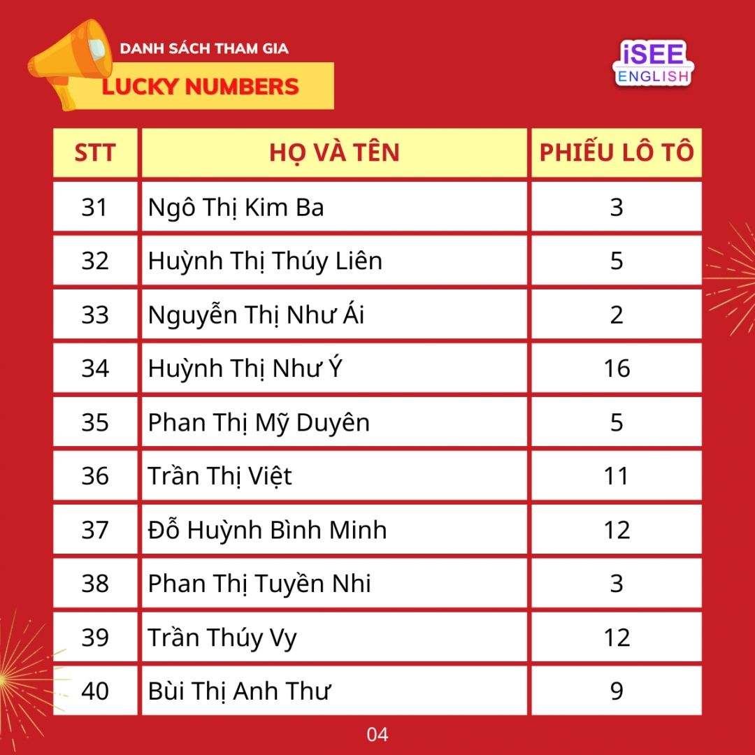 Trang chủ Tin hoạt động CÔNG BỐ DANH SÁCH THAM GIA LUCKY NUMBERS CÔNG BỐ DANH SÁCH THAM GIA LUCKY NUMBERSCác tin khácKhóa học VSTEP B1, B2, C1 - Tiếng Anh Bộ GD&ĐT TOEIC 400-750 - Tiếng Anh Quốc Tế IELTS - Tiếng Anh Quốc Tế iTALK - Tiếng Anh Giao Tiếp iBASIC - Tiếng Anh Căn Bản ISEE Kids - Tiếng Anh Trẻ Em Tiếng Anh Đầu Vào - ISEE Cần Thơ Tiếng Anh B1 - ISEE Cần Thơ Mục tiêu của khóa học VSTEPGiới thiệu Giới thiệu về ISEE Mạng lưới Chi nhánh Ban lãnh đạo Phương pháp dạy và học Các Đơn vị liên kết