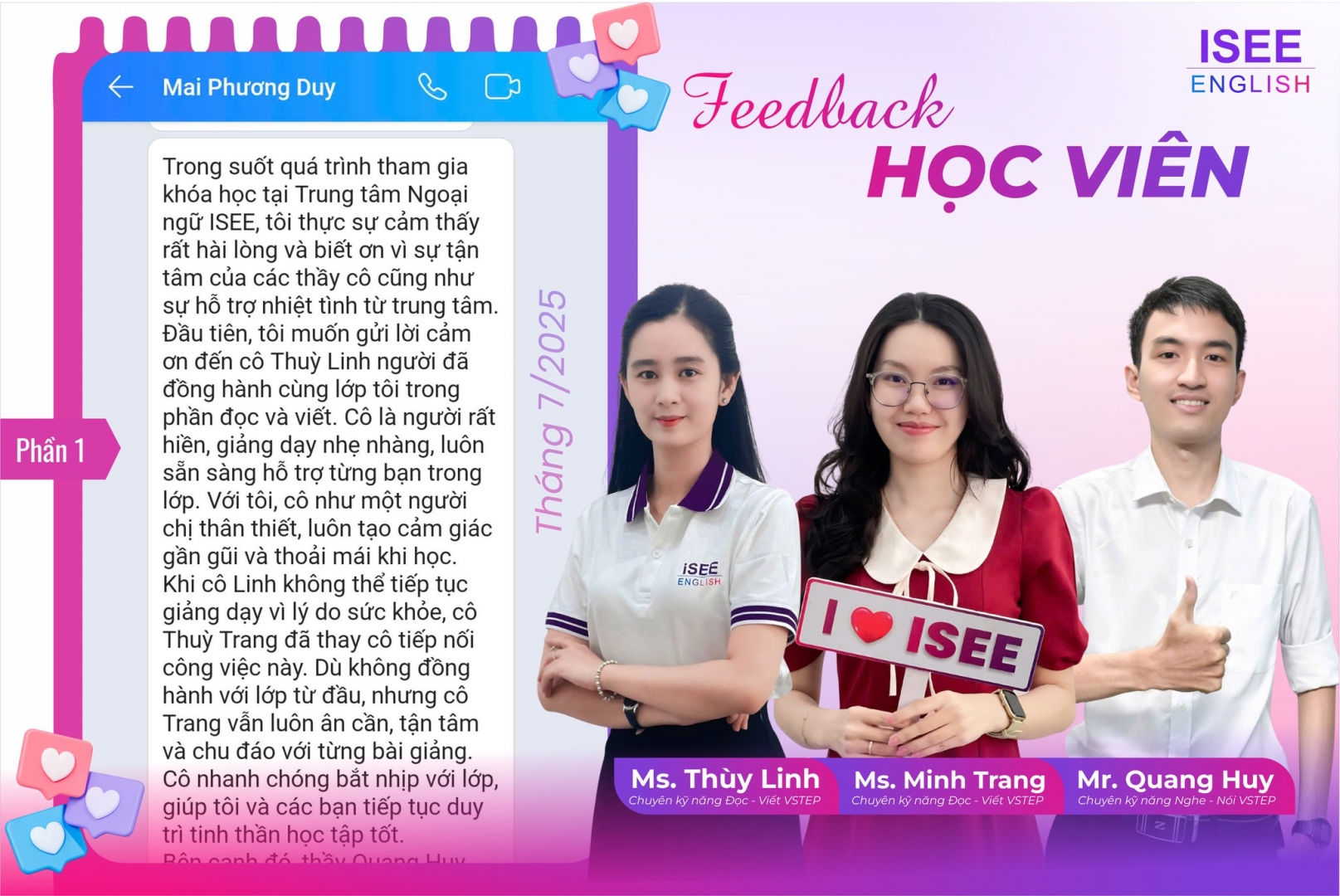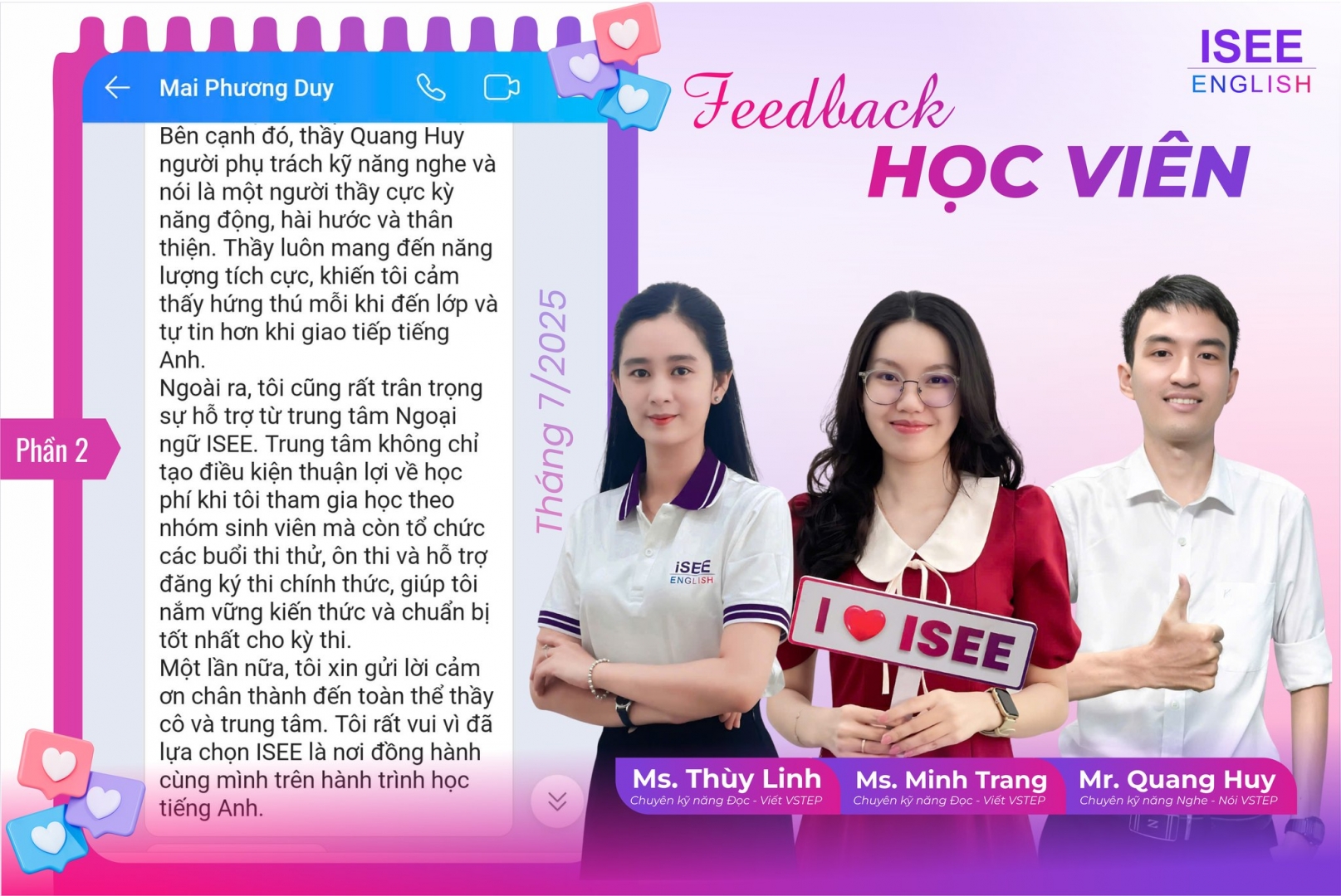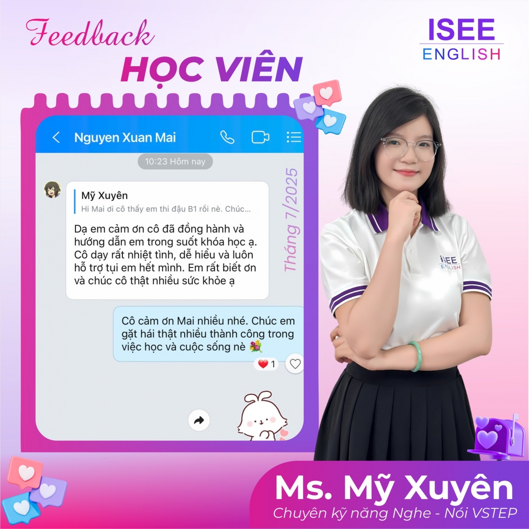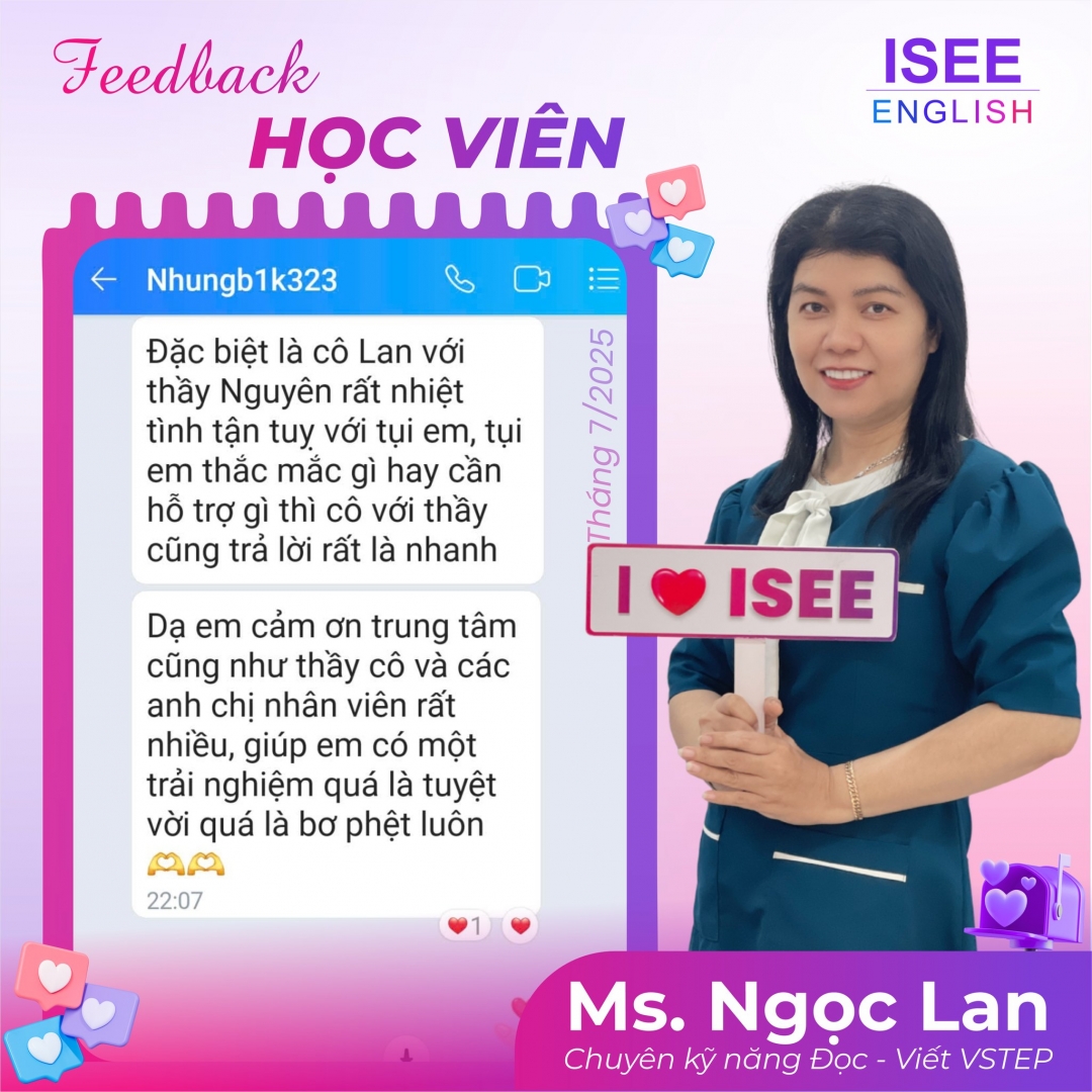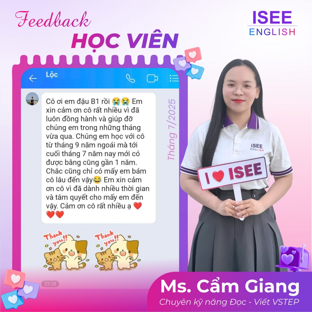 Trang chủ Tin hoạt động FEEDBACK CỰC XIN NHÀ ISEE FEEDBACK CỰC XIN NHÀ ISEECác tin khácKhóa học VSTEP B1, B2, C1 - Tiếng Anh Bộ GD&ĐT TOEIC 400-750 - Tiếng Anh Quốc Tế IELTS - Tiếng Anh Quốc Tế iTALK - Tiếng Anh Giao Tiếp iBASIC - Tiếng Anh Căn Bản ISEE Kids - Tiếng Anh Trẻ Em Tiếng Anh Đầu Vào - ISEE Cần Thơ Tiếng Anh B1 - ISEE Cần Thơ Mục tiêu của khóa học VSTEPGiới thiệu Giới thiệu về ISEE Mạng lưới Chi nhánh Ban lãnh đạo Phương pháp dạy và học Các Đơn vị liên kết